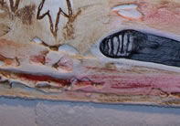 TEXTURING is extremely engaging showing reverse-negative “hunting clubs” in the texturing itself. Edges of prepared board are highlighted by white carved frame.