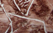 TEXTURING is heavy with many furrows and crevices lending to its natural earth-like appearance, in contrast to the stark flatness of the prepared board. The four corners have been cut away in a triangular fashion exposing texture of the carved surface. The figure is done in reverse negative.