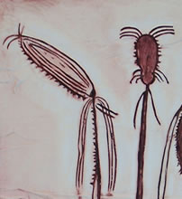 CULTURAL INSPIRATION: Anthropomorphic “Yam-People” are featured in this group of rock paintings done in Mimi Art. Their location is the Deaf Adder Creek, Kolondjorluk area in Arnhem Land. There are three yams in the shape of human beings. Much of this information has been handed down from the Aboriginal people. They say that the shoots of the plants represent human hair and the long roots are the limbs and bodies of the figures. The small lines protruding from the yam-people are the short roots of the yam plant. Roots and tubers play a large part in the Aboriginal diet. Yams were also believed to hold powerful properties and used in ritualistic medicine. They were often used on children, purportedly to make them stronger. When a baby was strong enough to roll over on its side, it was exposed to the steam and smoke of a baked yam. After the yam was peeled but still warm, it was applied to the child’s body as a treatment, making him fearless.